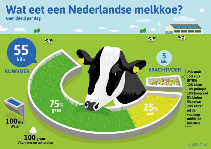 Een koe eet ongeveer 60 kilo voer per dag (55 kilo ruwvoer en 5 kilo krachtvoer). Dit is voornamelijk gras, maar ook ander ruwvoer zoals mais en resten uit de voedingsmiddelenindustrie. Daarnaast krijgen veel koeien krachtvoer, in deze brokjes is vaak mais, citrus, bieten, palmpit, raapschroot en soja verwerkt. Gemiddeld eet een Nederlandse koe 0,75 kilo soja per dag (1,25% van het totale rantsoen).